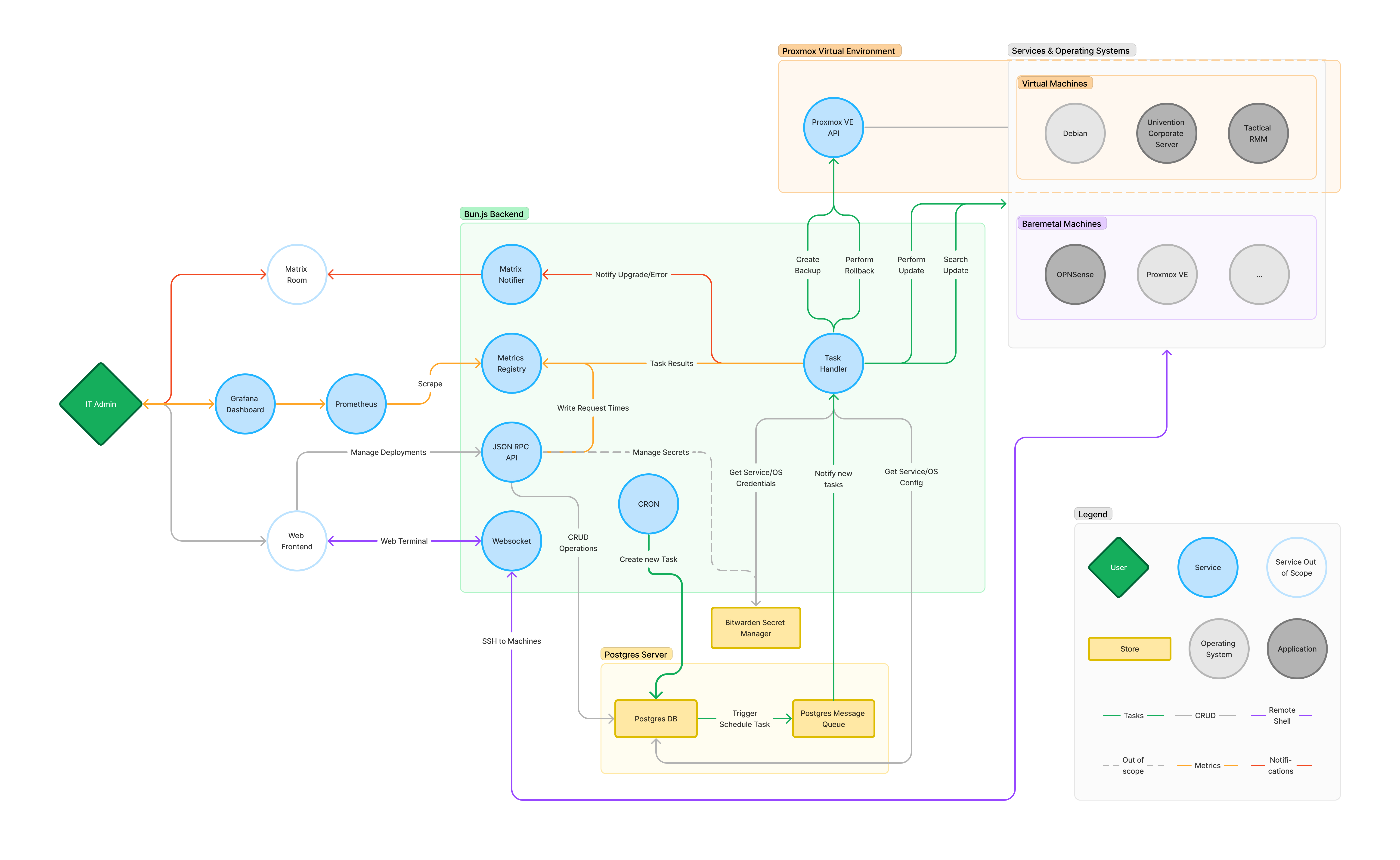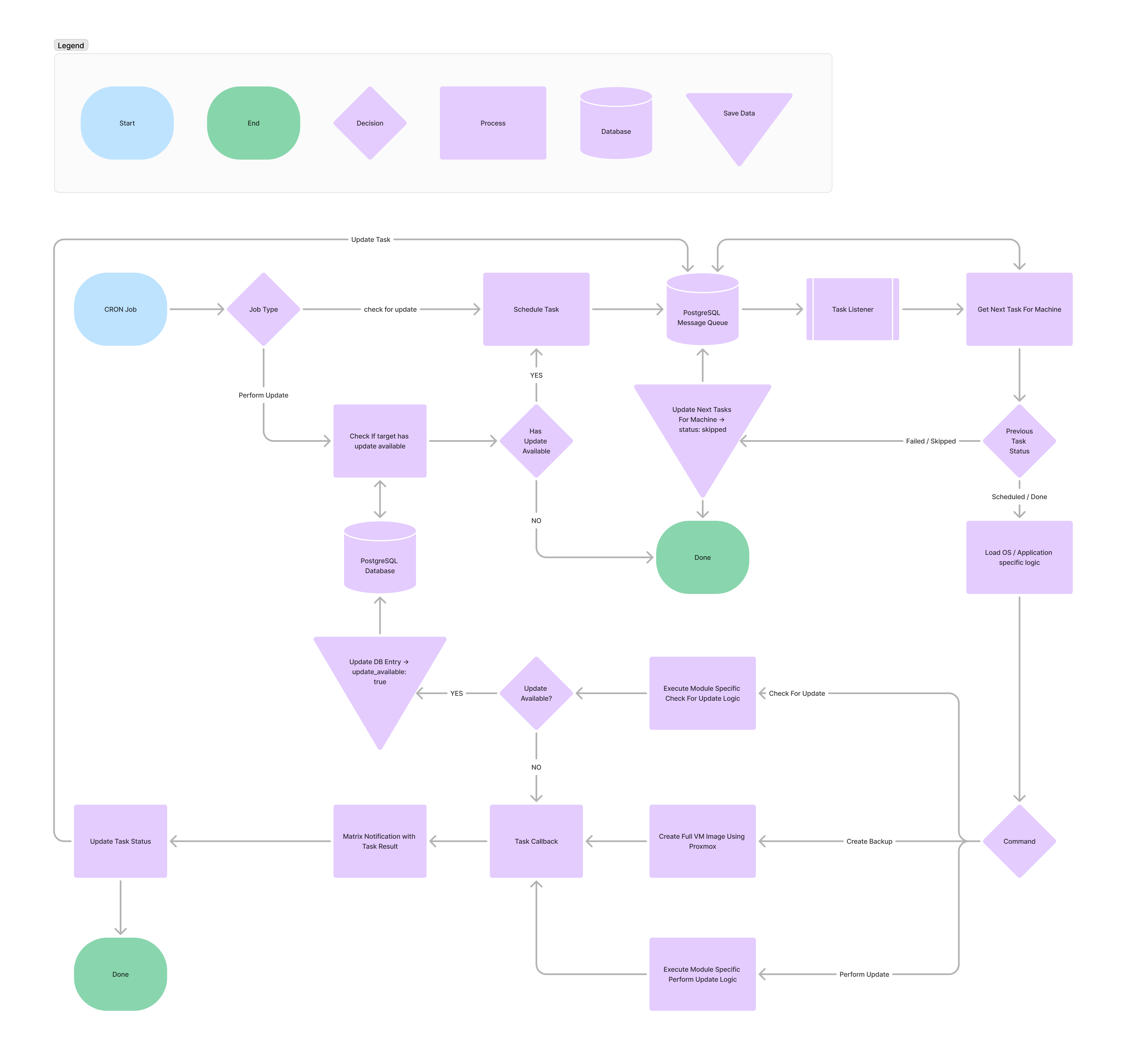 The somewhat complex logic of the task handler is skipped in the architecture diagram. Yet, they are the core of the WindAutomat software, taking care of the software updates. The following diagram visualises the logic flow from the CRON jobs to the execution of the commands on the target machines.